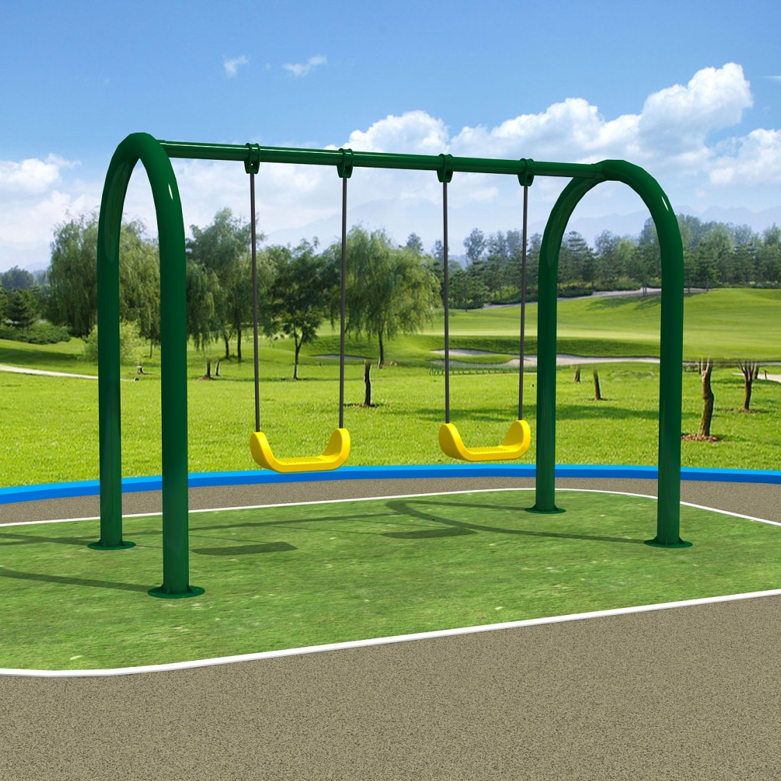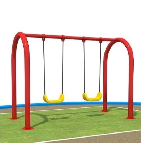 Altalena a due posti in acciaio zincato con seggiolini a tavoletta in polietilene, progettata per offrire stabilità, comfort e durata nel tempo.
