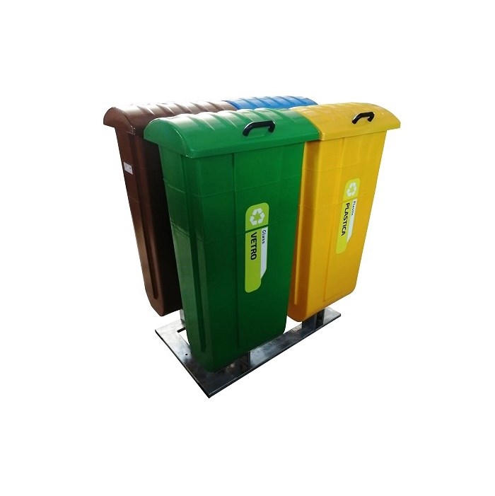 Isola composta da 4 portarifiuti da 65 o 90 litri, sopportata da una base in metallo zincata a caldo, dalle dimensioni di cm 51 × 85 realizzata in tubolare da mm 80 x 20 x 2.