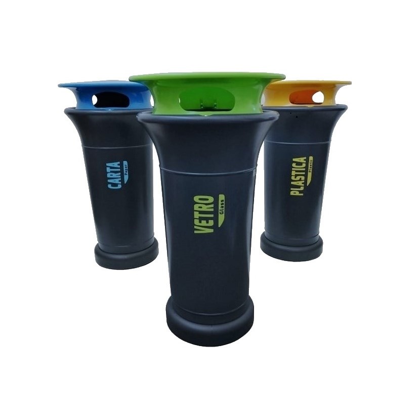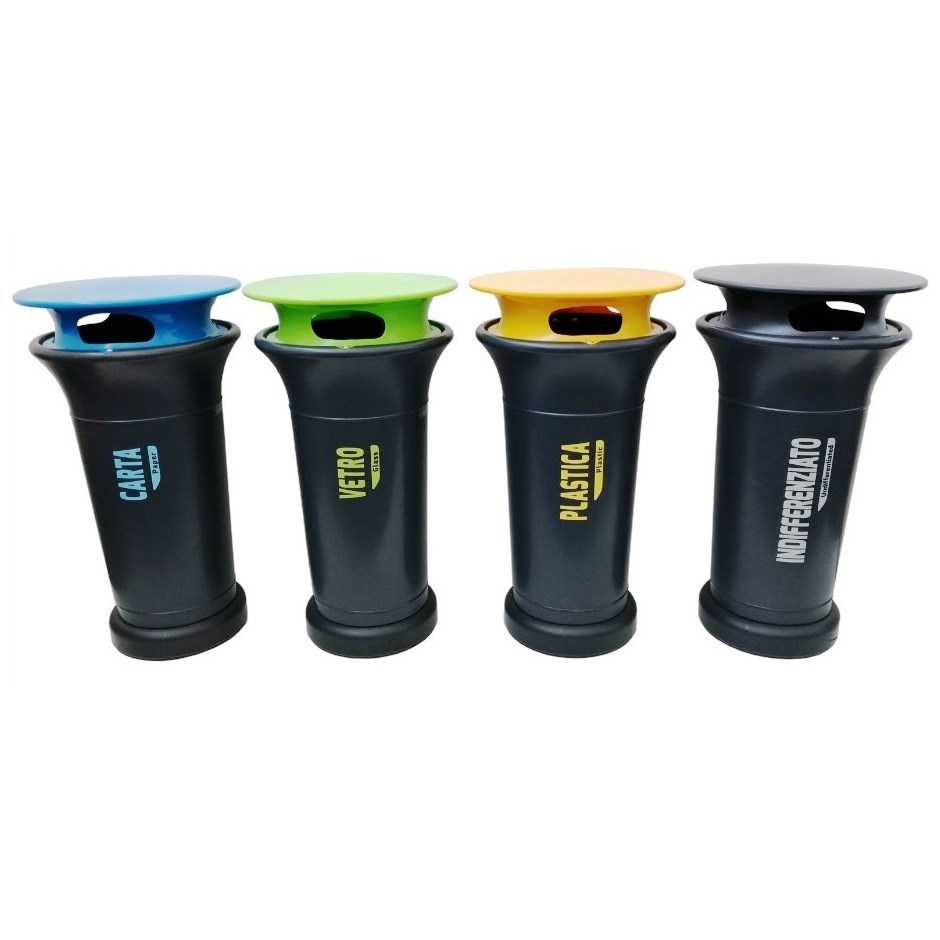 Il coperchio è alto cm 15 ed ha un diametro di cm 62 nella parte alta. Anch’esso costruito in HDPE si sovrappone al contenitore fissato con una cerniera nella parte retrostante del contenitore e bloccato allo stesso tramite una serratura a chiave triangolare.