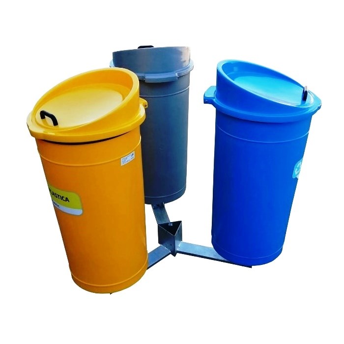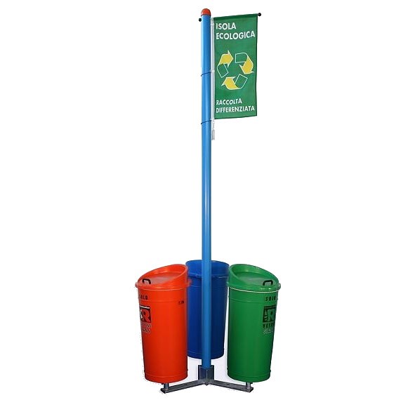 Isola composta da 3 contenitori da litri 105, supportata da una base in metallo, triangolare, zincata a caldo, realizzata in tubolare da mm 80 x 20 x 2.